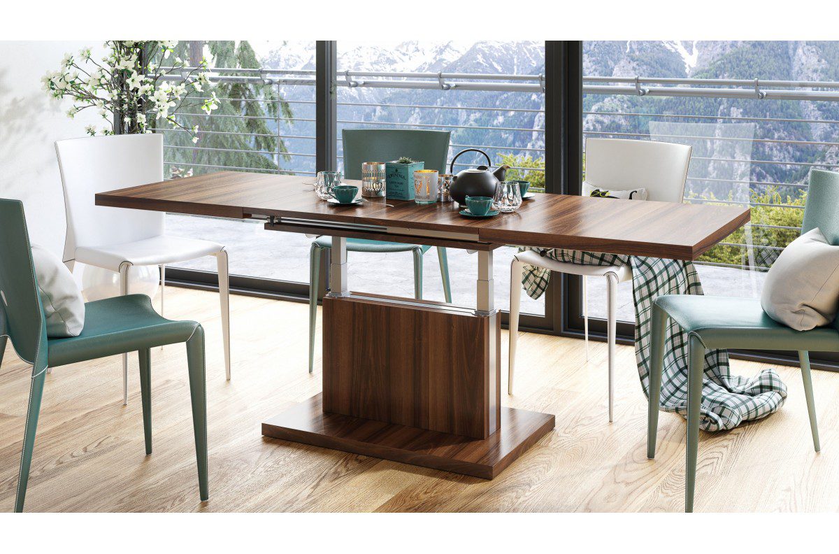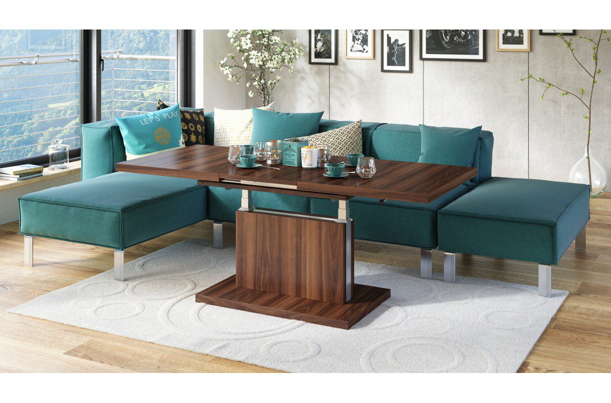 Dette robuste 2-i-1 bord fungerer perfekt som et stilrent sofabord, men med den trinløse pneumatiske lift forvandler du det hurtigt til et fuldvoksent spisebord.