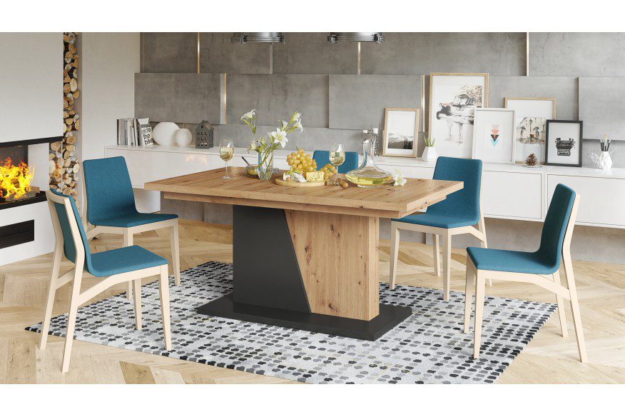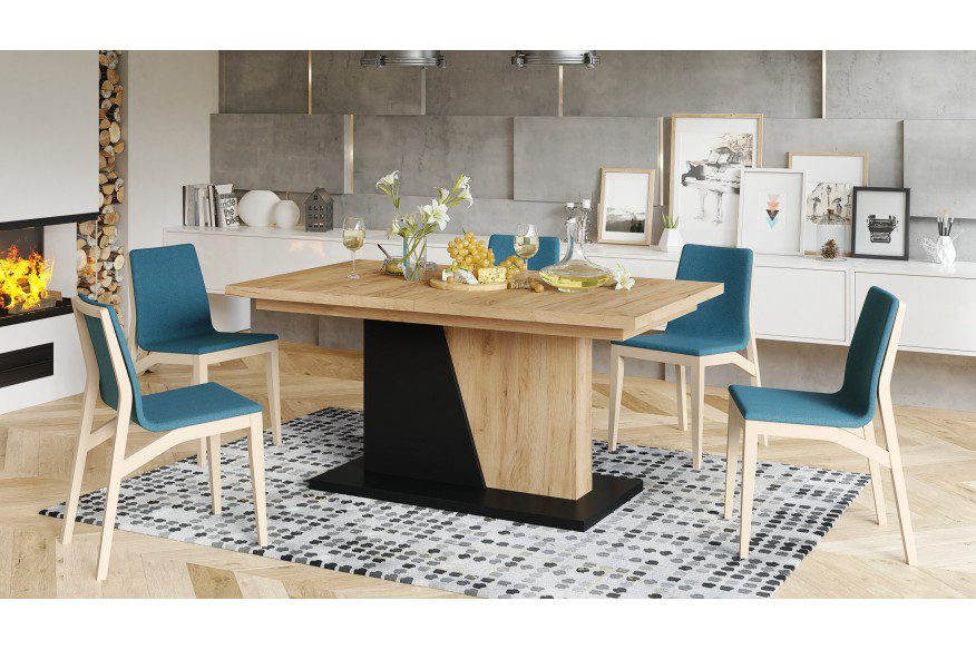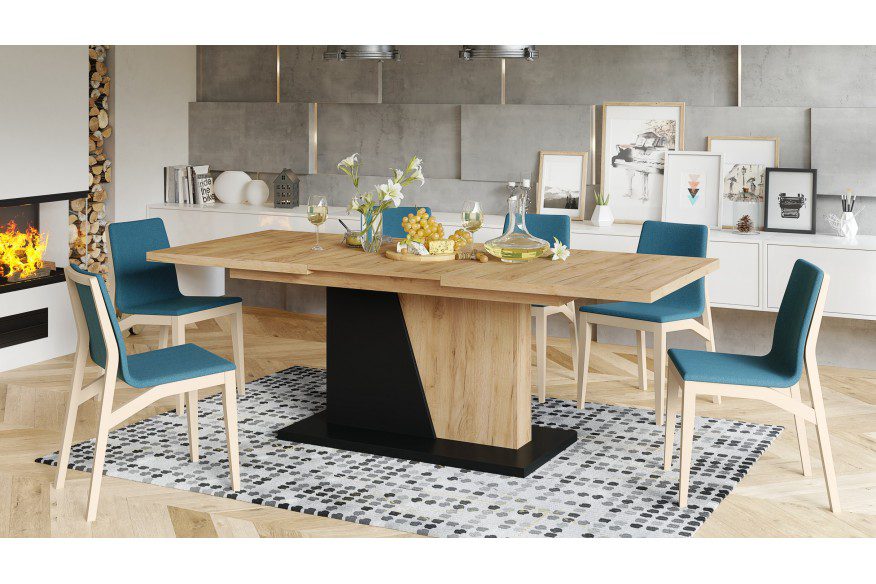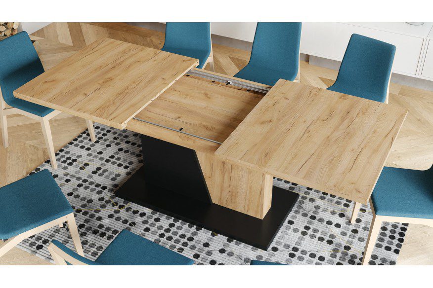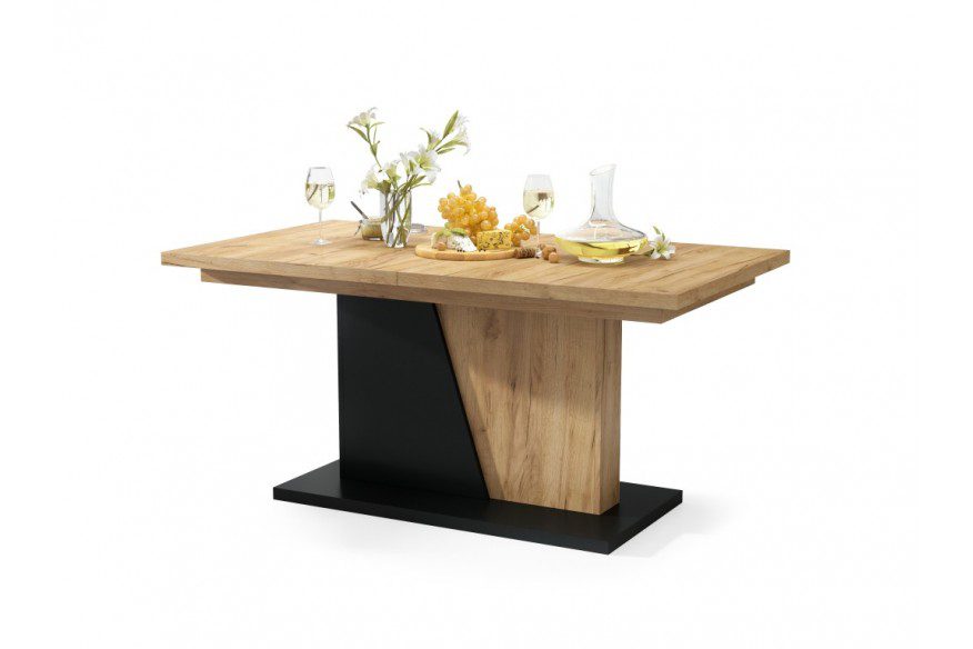 NOBLE NOIR – spisebord i gylden eg med sort sokkel (160-218 cm)
